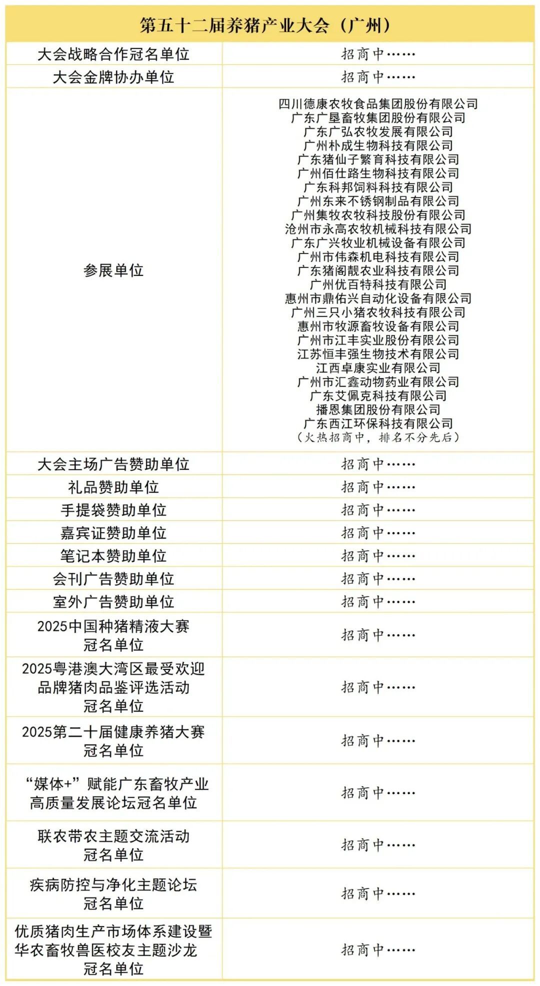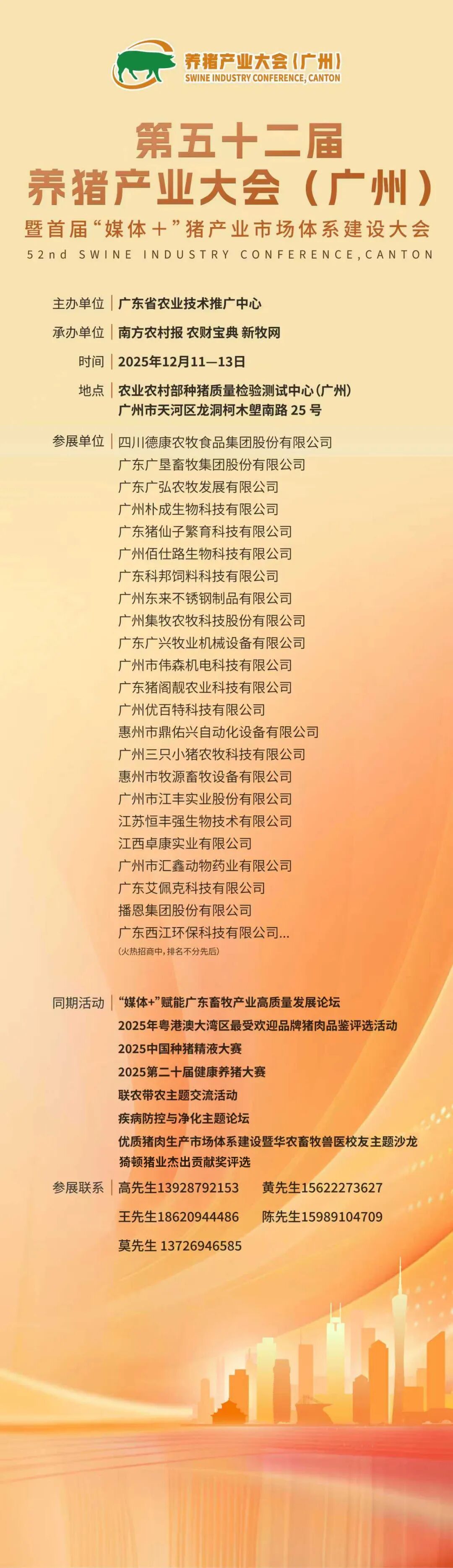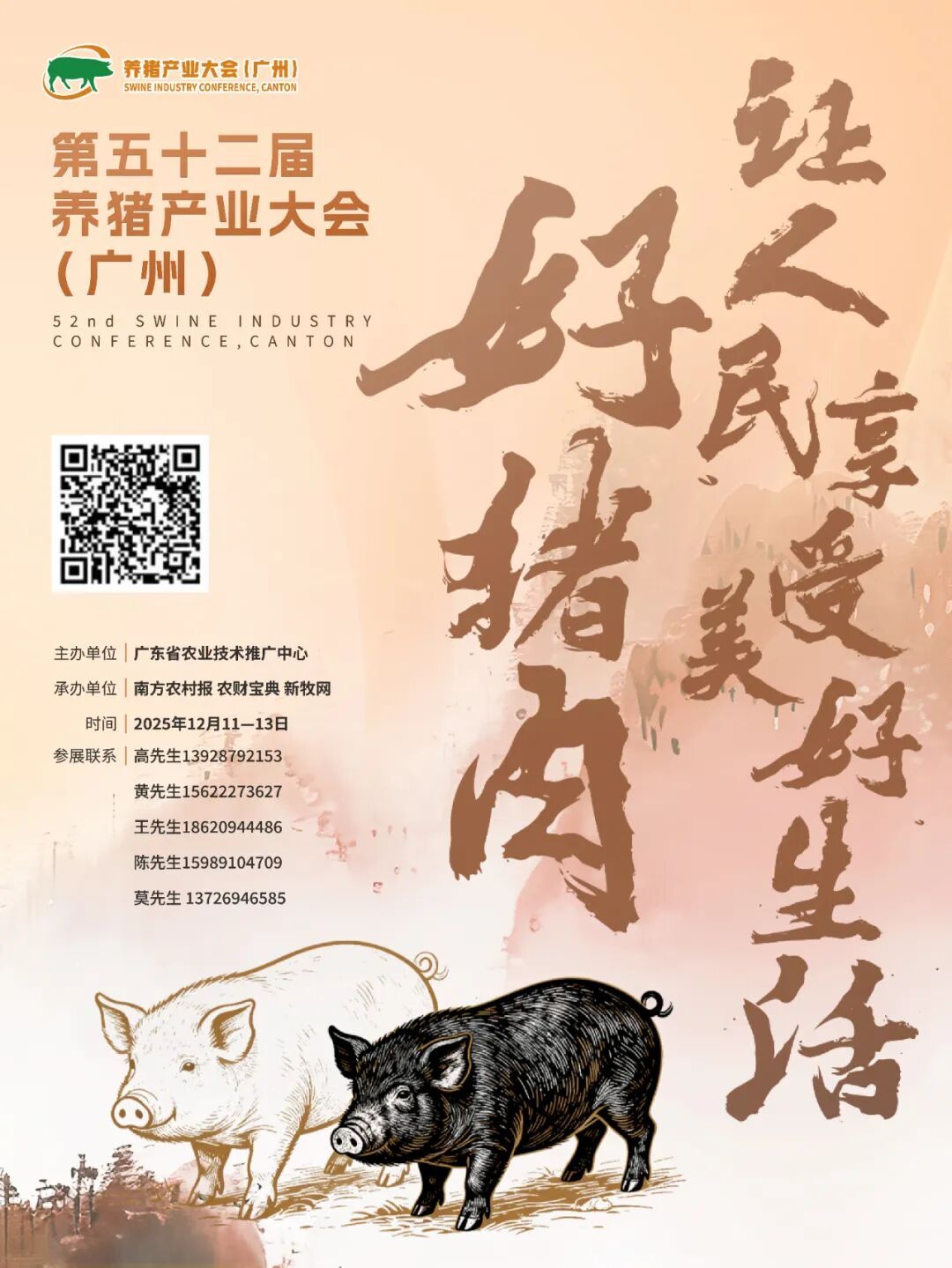 2025年12月11-13日,第五十二届养猪产业大会(广州)将于广州柯木塱农业农村部种猪质量检验测试中心隆重召开。大会由广东省农业技术推广中心主办,南方农村报社新富策略、农财宝典新牧网承办。